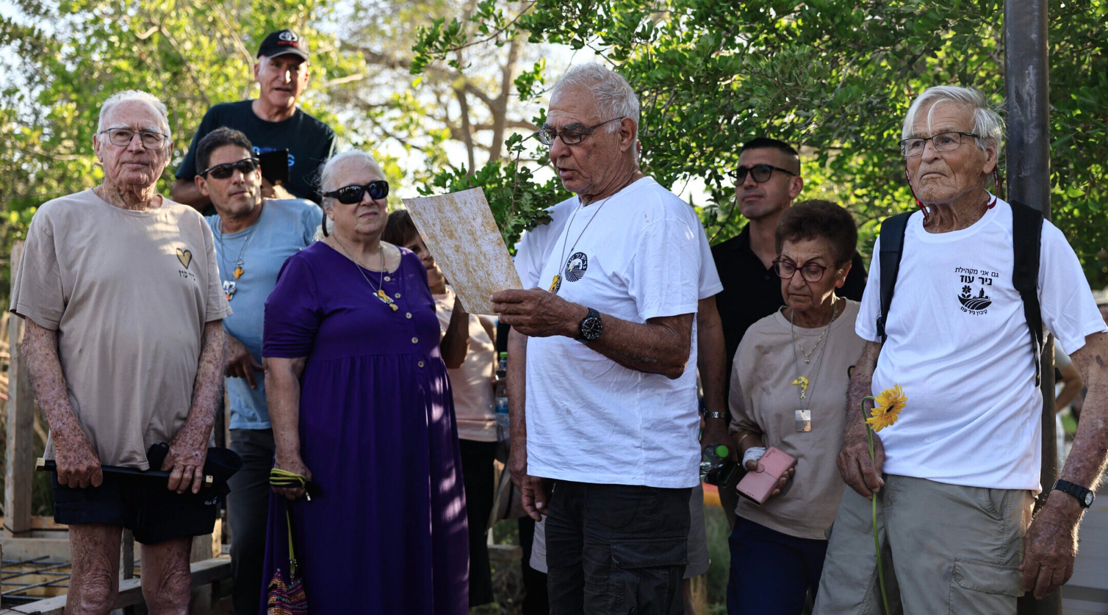 Released Israeli hostage Gadi Mozes at a ceremony marking rebuilding in Kibbutz Nir Oz, August 7, 2025. (Tsafrir Abayov/Flash90)