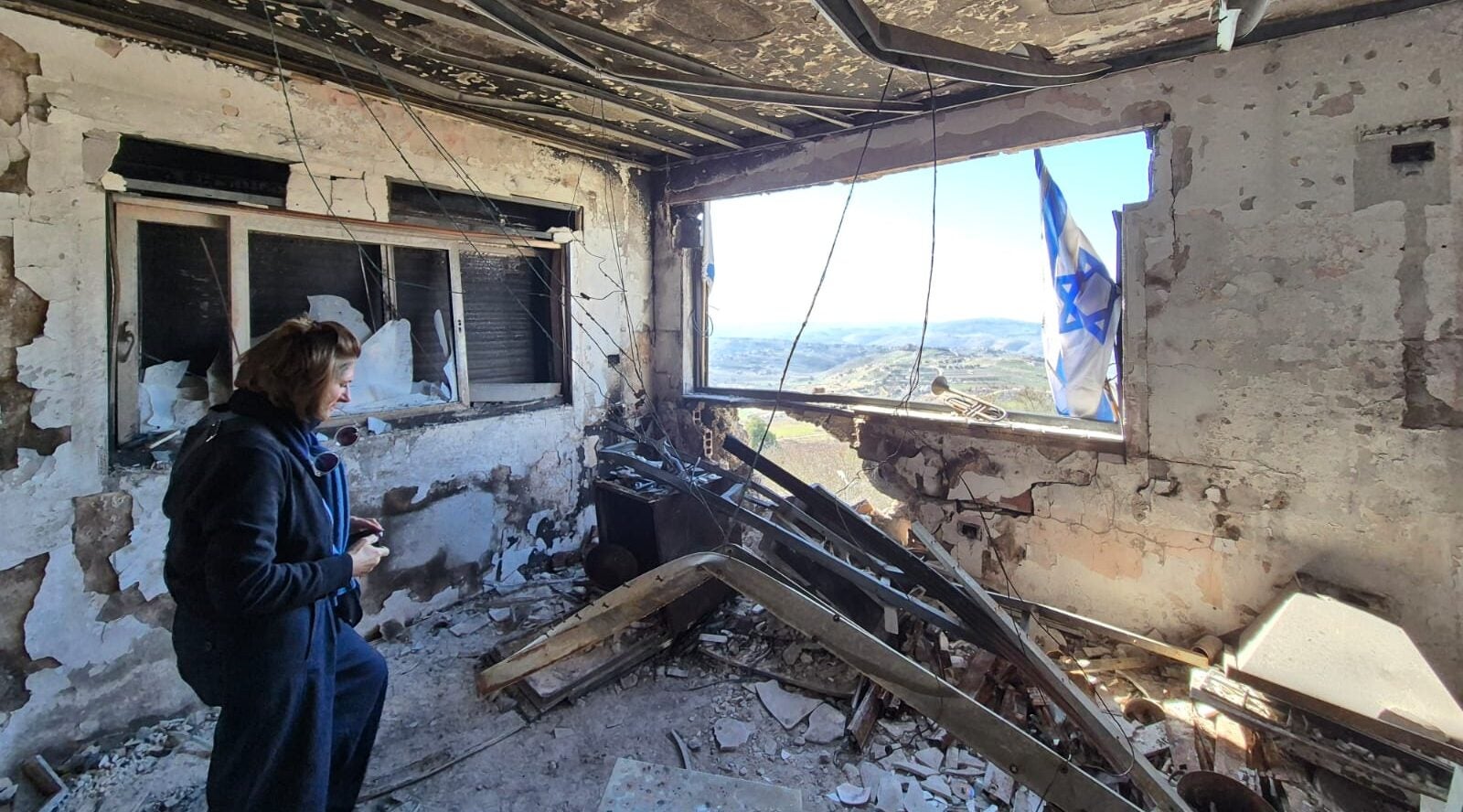 A resident gazes at the devastation at Kibbutz Manara in Israel’s north. (Courtesy KMRF)