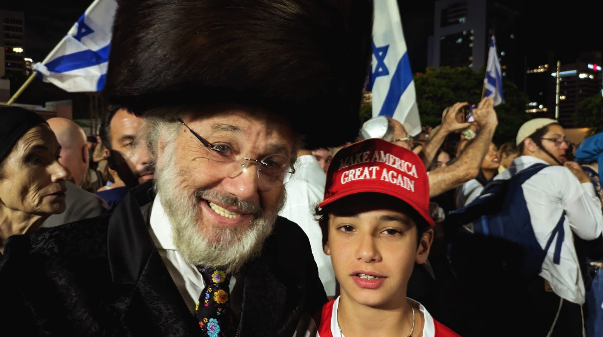 Nearby, Henri Rosenberg cut an unusual figure in Hasidic garb with a fur shtreimel and a “Bring Them Home” dog tag around his neck, standing beside his grandson who wore a red MAGA baseball cap. But despite appearances, Rosenberg said he no longer identified as haredi Orthodox, having grown disillusioned by what he called indifference within some haredi circles to the pain felt by other Israelis during the war. Health problems had led him to attend a nearby national-religious synagogue over the High Holidays, where, he recalled, “the cantor wept for the hostages and the soldiers.”